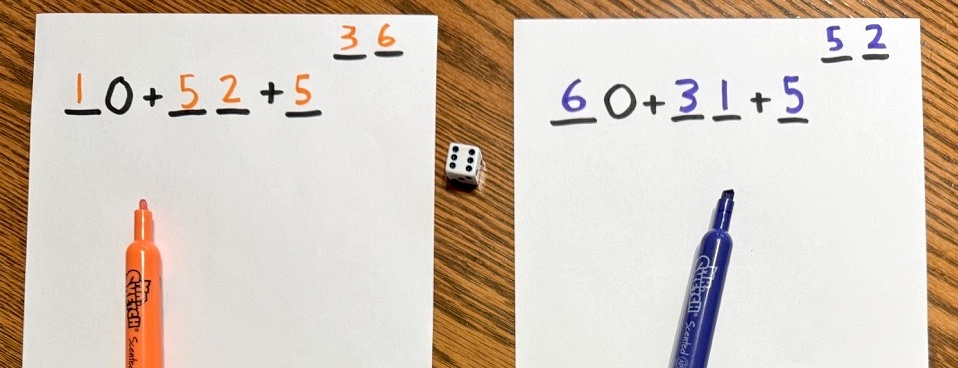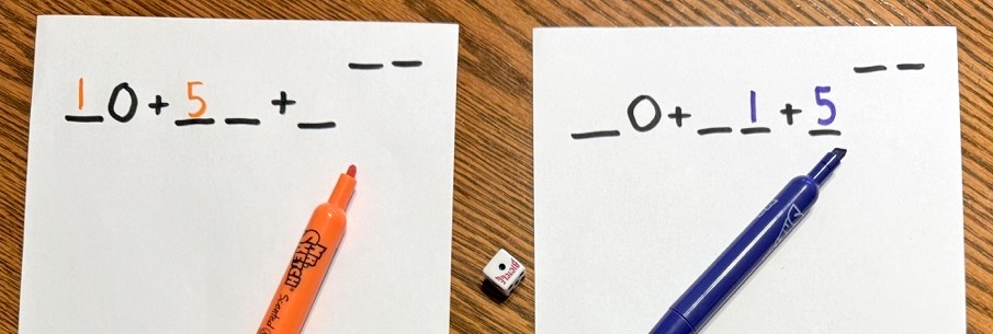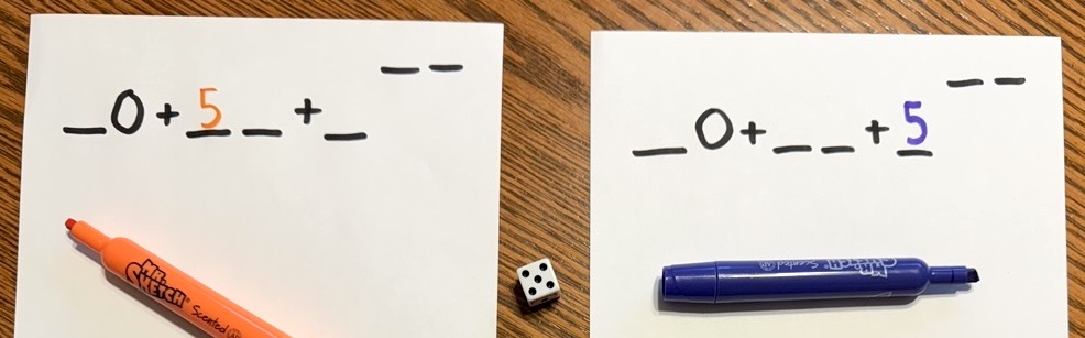 Then, we roll our die. The first number we roll is a 5. Pick a blank and place the 5 (you can’t move it once you place it).