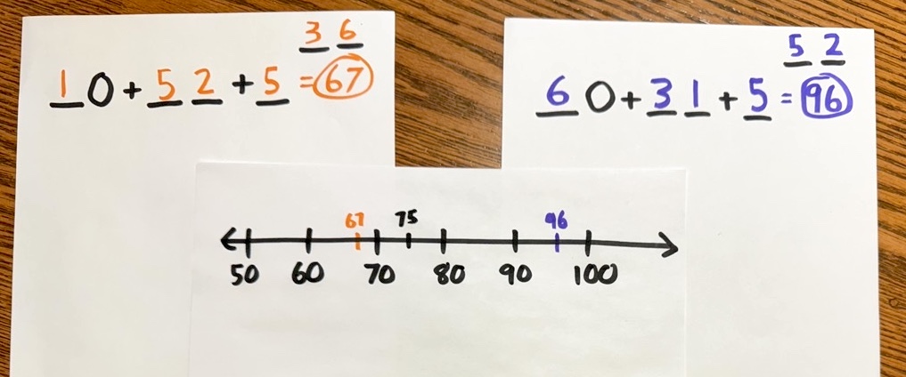 I want to share my favorite classroom math game: Number Boxes. This simple and flexible game allows you to practice any arithmetic topic. Let’s play a round now! Get a piece of paper and see if you can get closer to 75 than my two imaginary players.